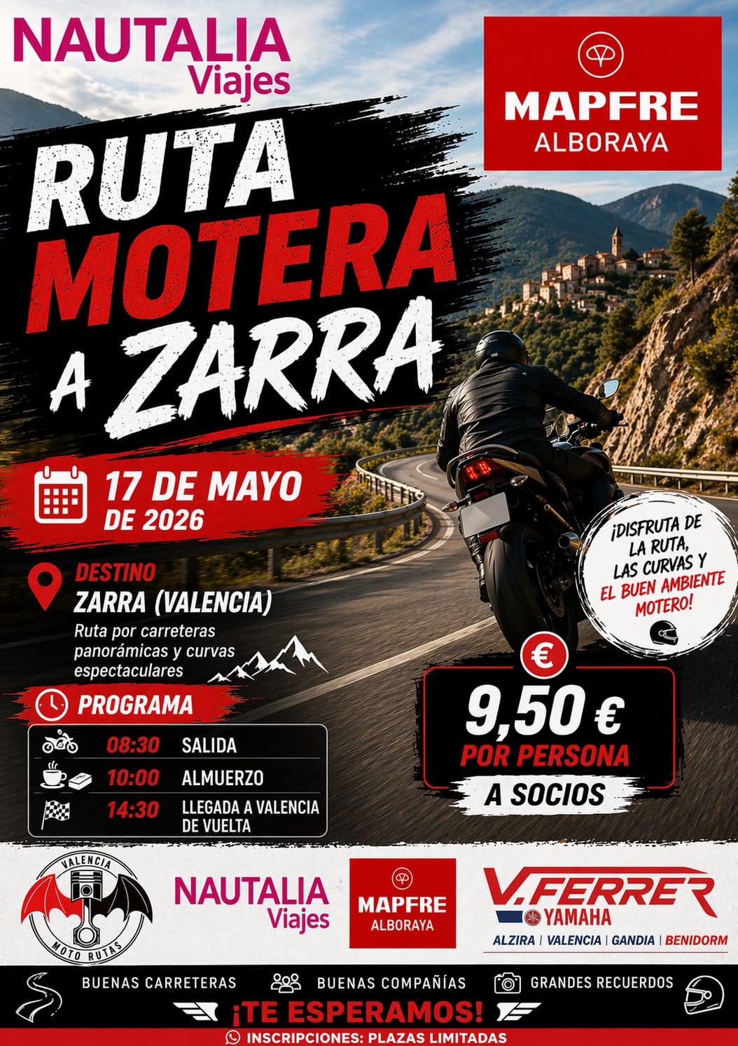 Valencia Moto Rutas organiza una nueva salida motera el próximo 17 de mayo de 2026 con destino a Zarra, una ruta pensada para disfrutar de la carretera, las curvas y de un entorno espectacular entre montañas y paisajes únicos de la provincia de Valencia.
